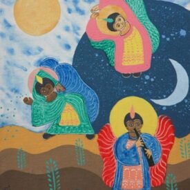 Em primeiro plano há três indivíduos. O primeiro indivíduo, canto inferior direito, figura masculina, de pé, cabeça reta, fisionomia contemplativa, pele morena, rosto arredondado, olhos grandes e azuis, nariz afilado, cabelos curtos e pretos, pescoço curto, braços flexionados à frente do corpo e segurando uma flauta de cor preta que o indivíduo toca, pés paralelos e calçados com sapatos marrons, veste única nas cores azul e laranja, possui um par de asas grandes na cor vermelha e linhas horizontais brancas, possui uma espécie de coroa em formato de gota na cor laranja, ao redor da cabeça há uma grande auréola na cor amarela. O segundo indivíduo, centro esquerdo, é uma figura masculina, pele negra, de pé, corpo inclinado à esquerda, fisionomia alegre, cabeça inclinada à esquerda, rosto arredondado, olhos grandes e marrons, nariz afilado, boca cerrada e afilada, cabelos curtos e pretos, pescoço curto, braço esquerdo flexionado à frente do corpo, braço direito flexionado por trás da cabeça, mãos esquerda espalmada, mão direita jogando algumas espécies de sementes de formato circular e cor verde no solo, pernas espaçadas, pés calçados com um sapato de cor preta, veste túnica de cor verde tom Spring green com detalhes em amarelo e rosa na parte central, possui uma espécie de gota em formato de losango em posição vertical e cor amarela no centro da cabeça, possui em uma aureola de cor rosa claro ao redor da cabeça, possui grandes asas na cor azul escuro com linhas horizontais de cor branca. O terceiro indivíduo, canto superior direito, é uma figura masculina, pele branca, de pé, fisionomia alegre, cabeça inclinada à esquerda, rosto arredondado, olhos amendoados e de cor azul, nariz afilado, boca cerrada, lábios cerrados e afilados, cabelos curtos de cor preta, pescoço curto, braços flexionados acima da cabeça formando uma espécie de círculo, mãos espalmadas, pernas estendidas, pés paralelos calçados com sapatos pretos, veste túnica de cor rosa tom coral e detalhes em amarelo e rosa na parte central, possui uma espécie de coroa em formato de gota de cor azul claro no centro da cabeça, ao redor da cabeça há uma aureola de cor laranja claro, possui grandes asas de cor verde tom Spring green com espécie de gotas delineadas em branco. Ainda em primeiro plano, parte inferior, há o solo, retratado por faixas onduladas compondo um degradê de marrons e com cinco plantas de cor verde; pequeno porte, formadas por uma faixa vertical (caule) e várias pequenas faixas diagonais ao redor (folhas). Em segundo plano há, do lado direito, um grande círculo de cor azul escuro, com vários círculos e uma meia-lua de cor azul claro no interior, esse círculo provavelmente simboliza um planeta. Ainda em segundo plano, canto superior esquerdo, há um círculo pequeno de cor laranja. Em terceiro plano há o céu predominantemente branco com “manchas” em azul escuro.